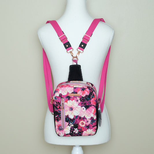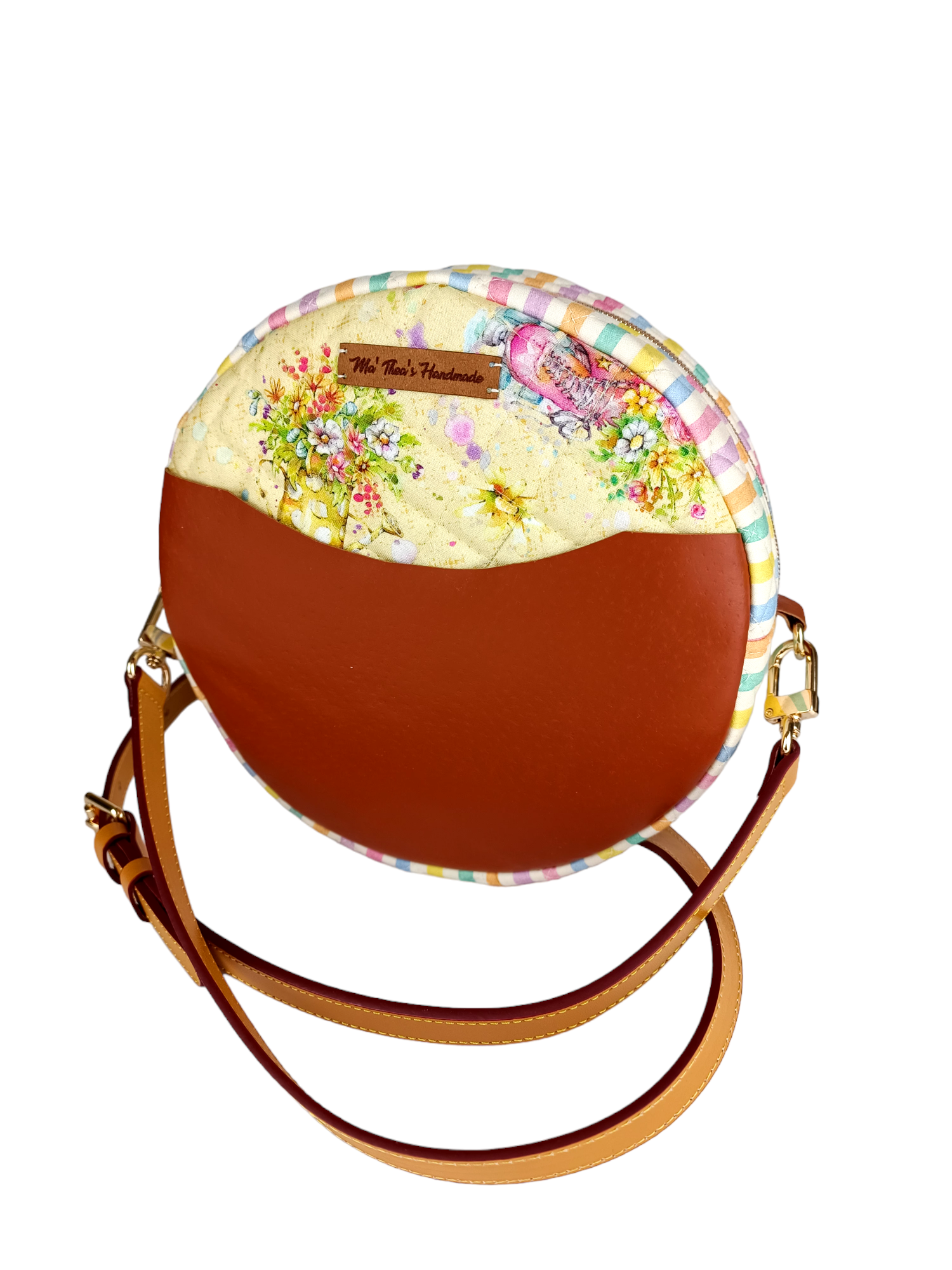 Quilted Halfmoon Crossbody Bag (White, Purple Flowers)
