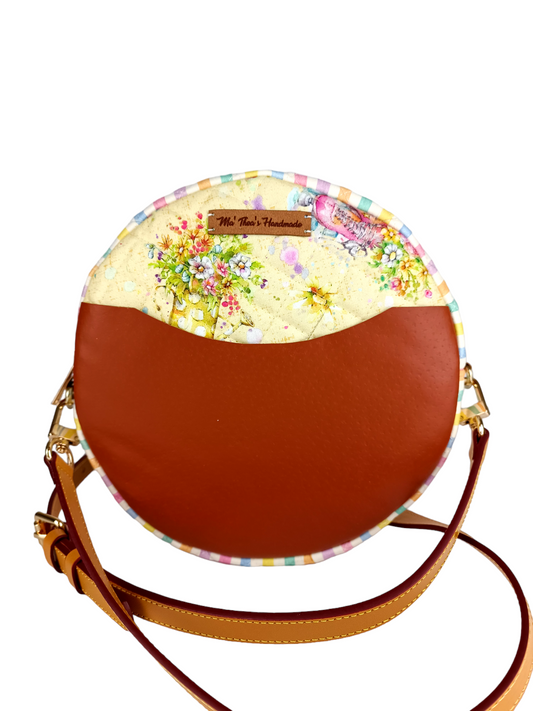 Quilted Halfmoon Crossbody Bag (White, Purple Flowers)