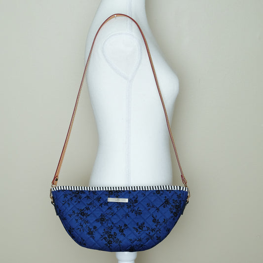 Quilted Halfmoon Crossbody Bag (Deep Blue, Black Flower)