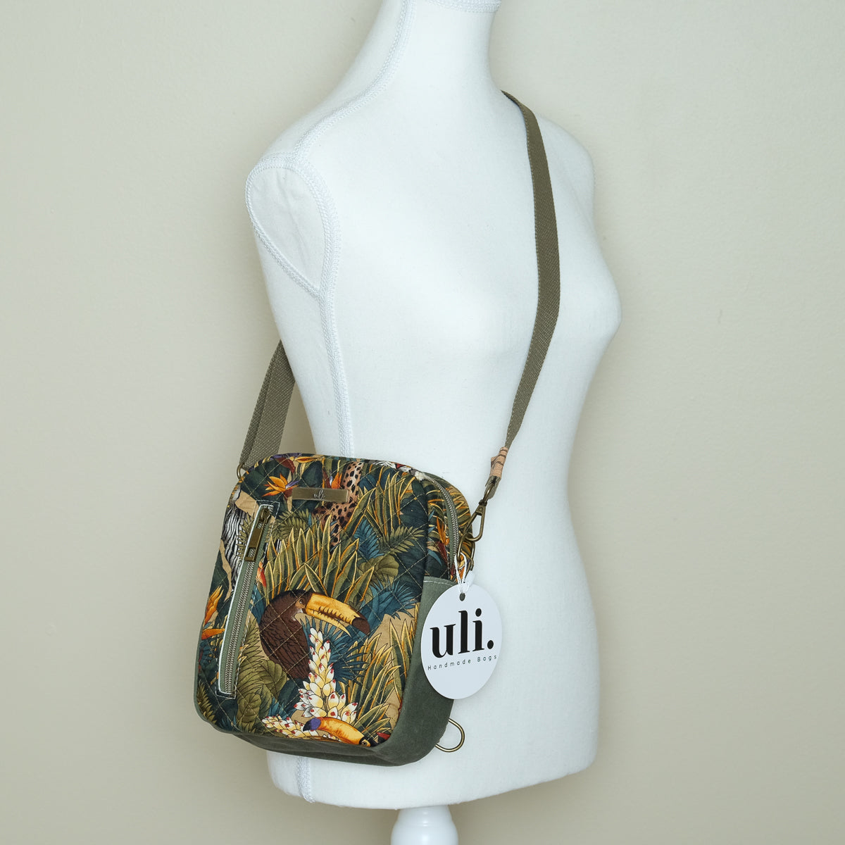 This bag is made from 3 different materials: quilting cotton, waxed canvas, and corduroy. It is quilted with foam featuring one front zipper pocket, one back corduroy pocket, one zipper pocket and two slip pockets inside, and finished by using binding method. With two cotton webbing straps, this bag can be used in three different styles: Crossbody bag, backpack, shoulder, and sling bag.